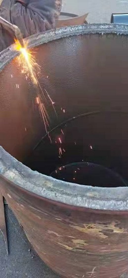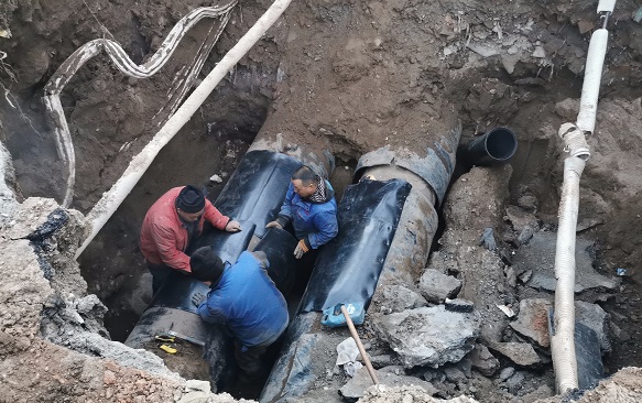 在場(chǎng)人員研究制定了搶修方案,決定不更換管道,而采用"包裹式"的方式進(jìn)行修復(fù)--在原DN700的老舊管道上包裹DN800的管套封堵漏點(diǎn),將DN800的管道切割成兩部分,分別安裝,與水泥管道接近的部分打磨成壁度在4公分以內(nèi)的管壁,焊接后進(jìn)行管道碰口。當(dāng)時(shí),室外溫度已降至-15℃,地溝內(nèi)溫度高,地面溫度低,施工難度大。為保證快速、高效、安全完成新管套接,搶修人員只能手提工具沿著管道貓著腰爬到連接處,窩在管道下方,在管套與管網(wǎng)連接處焊接。