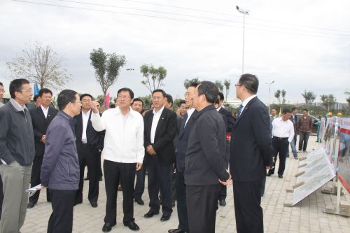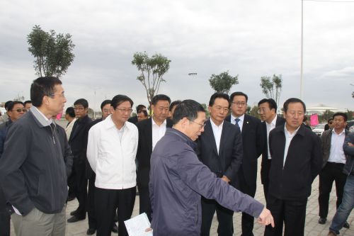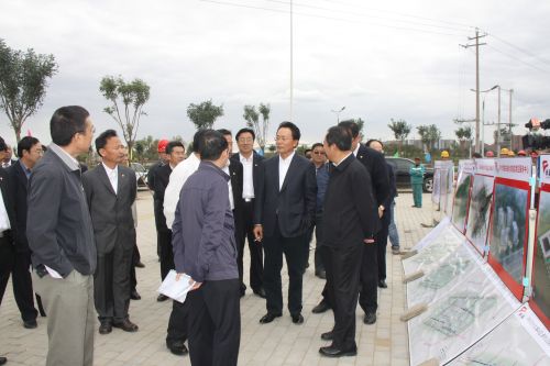 2012年9月12日,中國農業發展銀行領導一行來我市考察東客站項目工程,市長秦義、副市長孫建華等陪同考察。圖為公司副總經理史繼文介紹東客站項目建設情況。