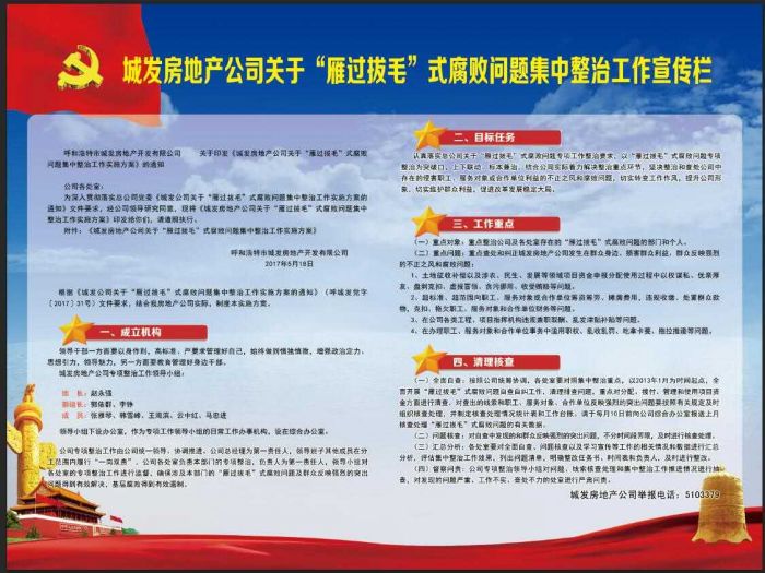 5月開始,按照市委市政府要求,城發(fā)公司開展了“雁過拔毛”式腐敗問題集中整治工作,公司高度重視集中整治的宣傳和自查工作,并將其作為集中整治“雁過拔毛”式腐敗問題的重要任務(wù),精心組織、迅速行動(dòng),總公司制訂了《城發(fā)公司關(guān)于“雁過拔毛”式腐敗問題集中整治工作宣傳方案》,各分子公司都結(jié)合自身實(shí)際制訂了可操作性強(qiáng)的宣傳方案,讓廣大職工群眾知曉并支持,參與集中整治。公司通過總公司及分子公司各級(jí)網(wǎng)站、微博、微信公眾號(hào)、微信群、LED大屏幕、LED條屏、噴繪宣傳板、條幅、宣傳欄、動(dòng)員會(huì)議面對(duì)面宣傳等10多種載體和形式30多幅宣傳內(nèi)容認(rèn)真進(jìn)行宣傳,確保把集中整治“雁過拔毛”式腐敗問題工作深入宣傳至一線干部職工中,讓廣大干部職工及群眾充分了解并參與到宣傳工作中,通過廣大干部職工將宣傳活動(dòng)輻射到千家萬戶,提高了社會(huì)群眾對(duì)集中整治“雁過拔毛”式腐敗問題工作的知曉度